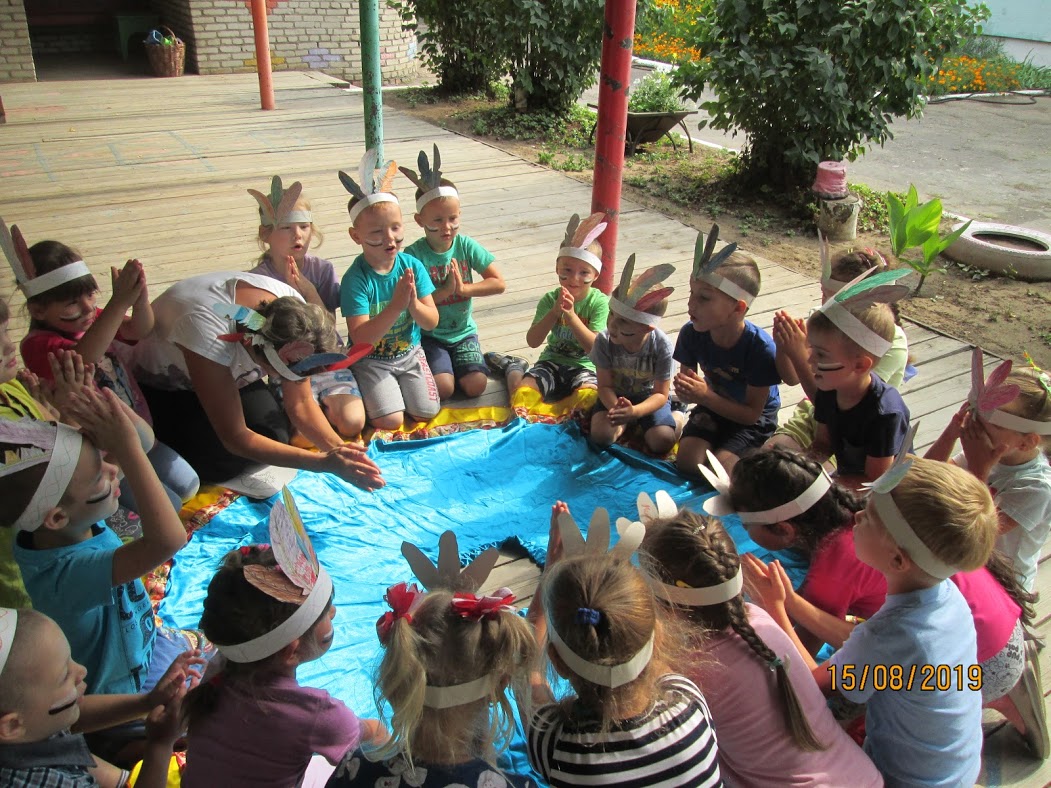 Дети и взрослые смогли в этот тематический день попробовать себя в роли индейских воинов, разделившись на два племени «Цветное перо» и  «Пестрое перо». Все дети собрались возле круга дружбы, у которого детей посвятили в индейцы. Вождь предложил найти ответы на загадки древних времен. Ребята скакали на резвых скакунах, играли в игру «цепи», перепрыгивали через канавы, ходили по извилистой тропе, кормили обезьян кокосами. Пройдя все испытания, дети получили зашифрованную карту, по которой нашли клад  древних индейцев. В благодарность племена исполнили  танец для вождей.